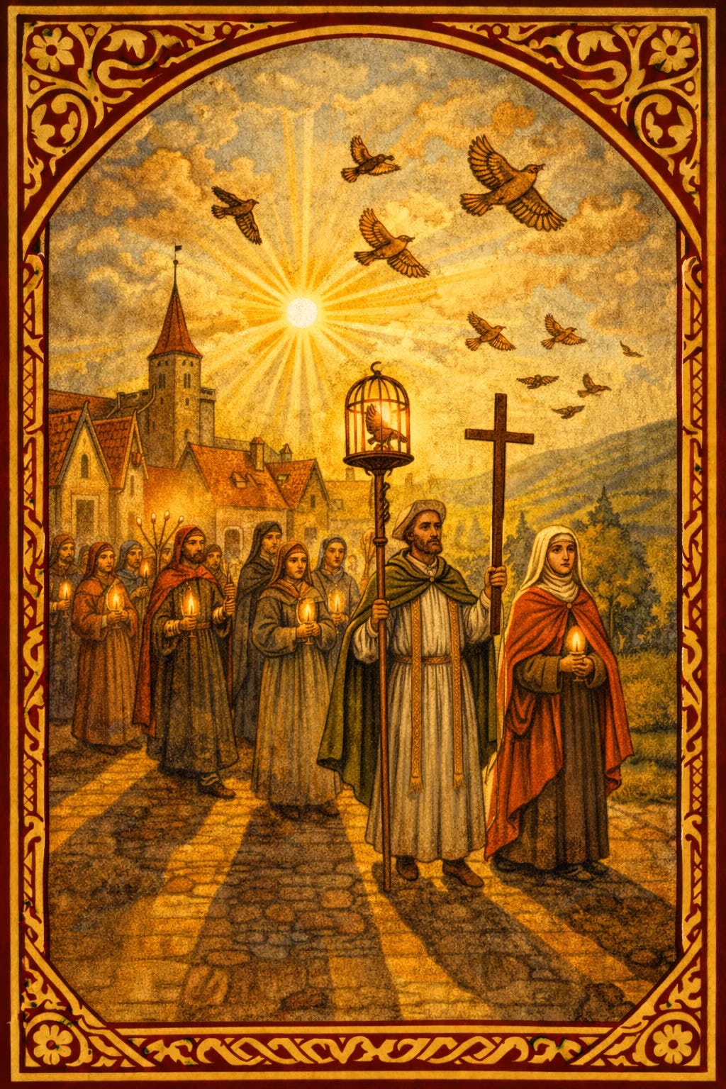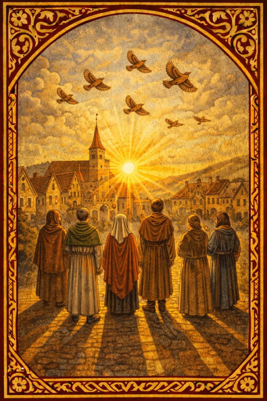 Imagine a square alive with presence, echoes of courage through centuries. The wrens rise—small, vigilant, symbolic of hidden truth and divine witness. Marguerite walks among us, her charred book glowing. Mary Magdalene lifts her head, sunlight tangled in her hair.