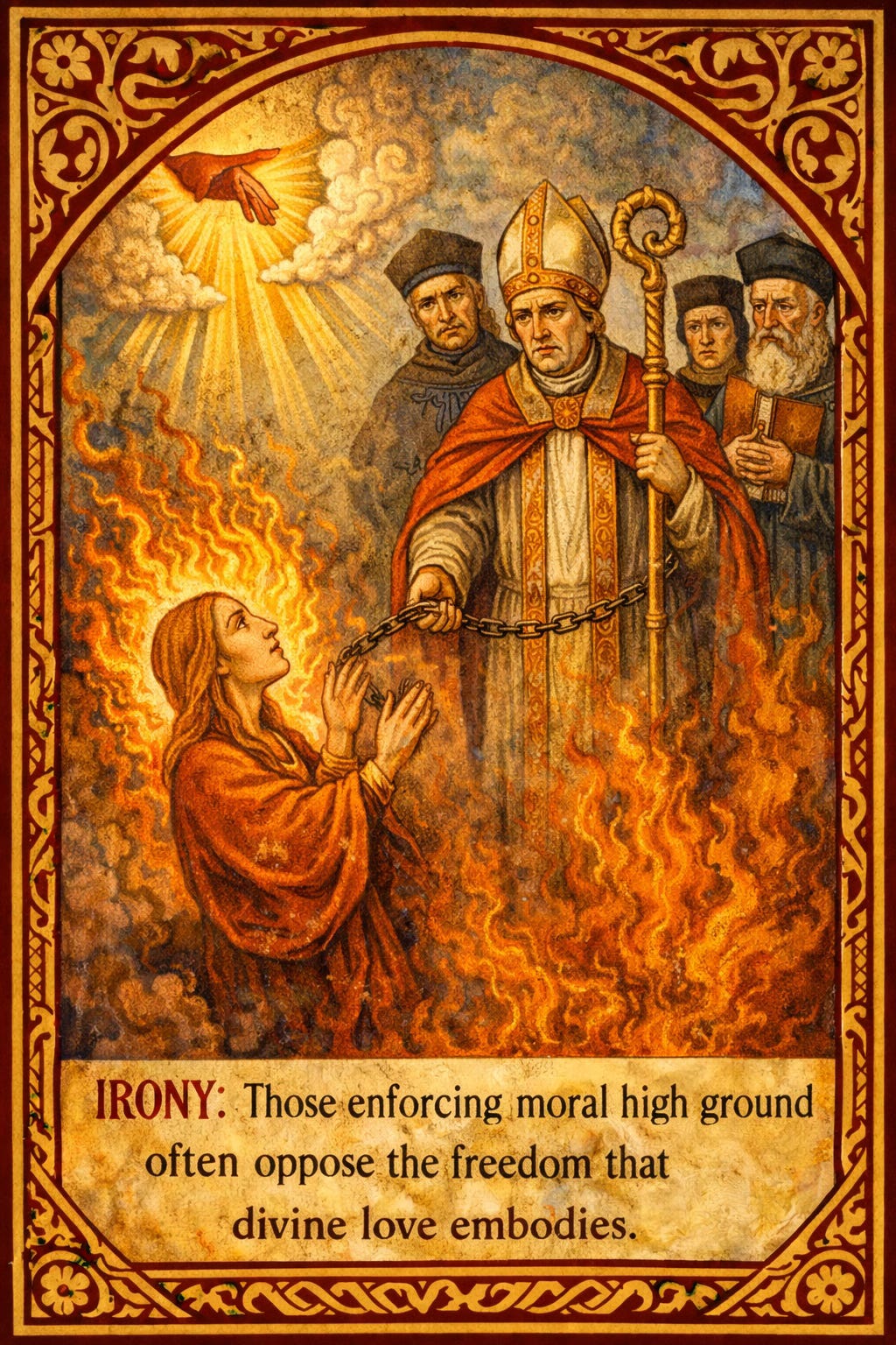 Institutions often enforce moral agendas as tools of control, creating fear and conformity. Marguerite and Mary were silenced to maintain hierarchy. Divine love, however, is liberating: